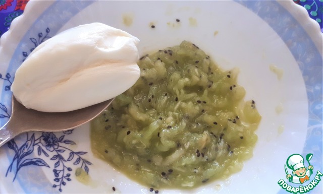 • Вынимаем мякоть киви, тщательно разминаем, смешиваем с тёртым на мелкой тёрке чесноком.