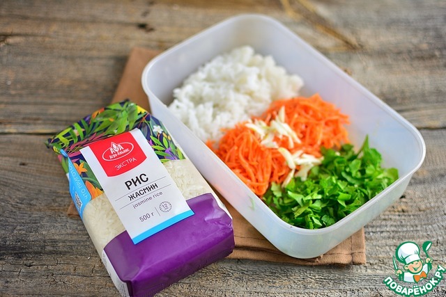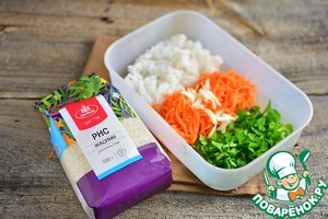 Рис смешать с морковью, рубленным чесноком и зеленью.