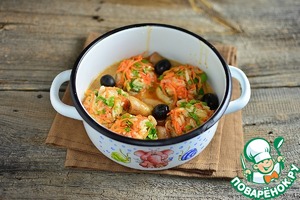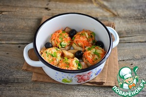 Из начинки руками сформировать 5 плотных шариков, выложить начинку в шляпки шампиньонов. Грибы выложить в подходящую кастрюльку. В промежутки добавить ножки от грибов и маслины.
