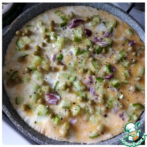 Пару кусочков кабачка и лука красного нарезаем очень мелко. С горошка сливаем жидкость. В посуду разбиваем 2 яйца, солим и перемешиваем. Греем сковороду (у меня сковорода D-24 см), наливаем масло и размазываем по всей сковороде. Выливаем яйца. Как только омлет начнёт схватываться, присыпаем верх его порезанными кабачком и луком, добавляем зелёный горошек. Это мой набор овощей. Можно взять и другие овощи, которые вы любите. Не принципиально. По желанию поперчите!