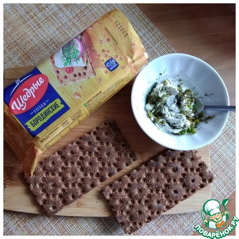 В творожный сыр добавляем порезанный укроп или какую-то другую зелень, которую вы любите. Перемешиваем. Для бутербродов я буду использовать хлебцы бородинские "Щедрые".