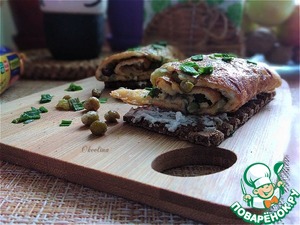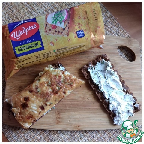 Щедро намазываем хлебцы сыром с зеленью и выкладываем поверх омлетный рулет. По одной половинки на каждый хлебец. Половинки рулета у меня получились как раз с длину хлебца.
