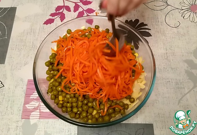 Кроме того, добавляем консервированную кукурузу, консервированный зеленый горошек, корейскую морковь.
