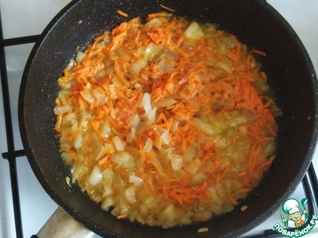 Морковь и лук мелко порезать и обжарить на растительном масле до готовности.