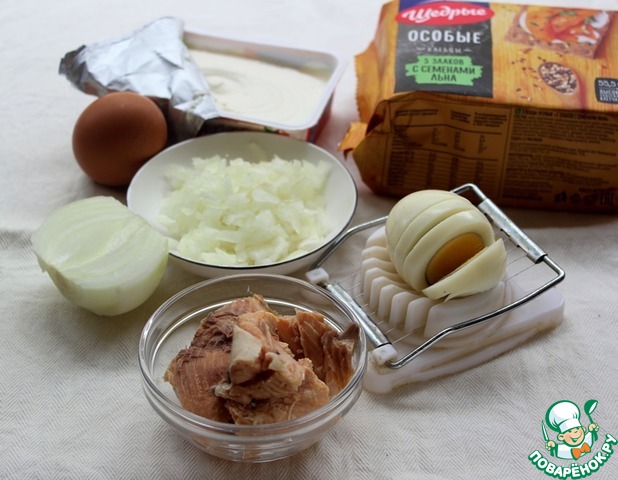 • Отварить яйца, лук нарезать, вилкой размять рыбные консервы. Консервы можно брать на свое усмотрение и вкус.