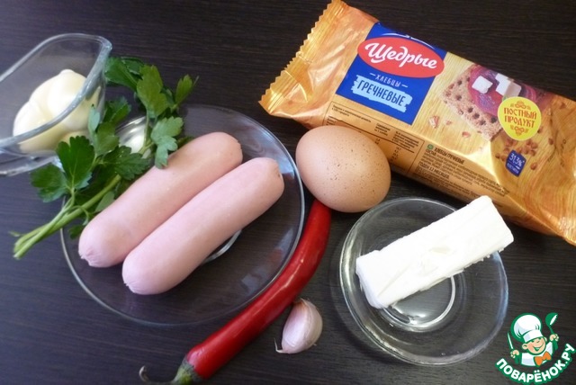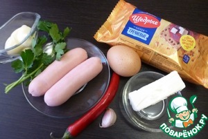 Подготовить ингредиенты. Яйцо сварить вкрутую, сосиски отварить.