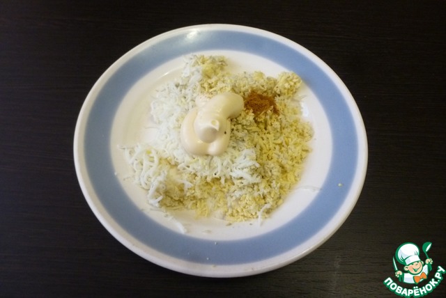 Яйцо натереть на терке вместе с чесноком. Добавить майонез и немного куркумы для цвета.