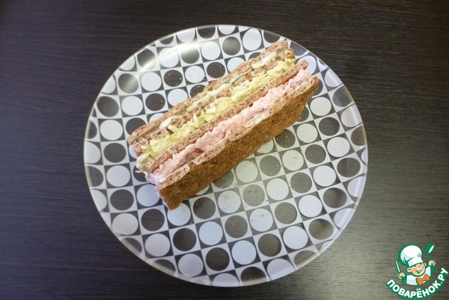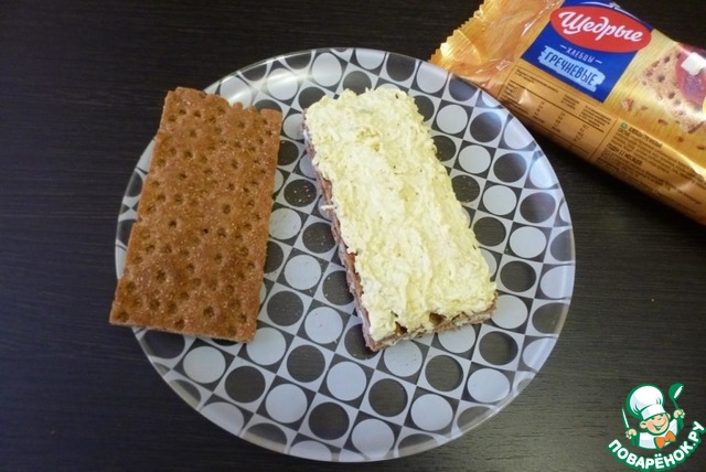 Прикрыть четвертым хлебцем. Слегка придавить, чтобы начинки плотнее соприкоснулись с хлебцами.