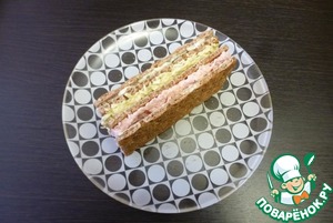 Третий хлебец смазать массой из сосисок и положить на второй хлебец.