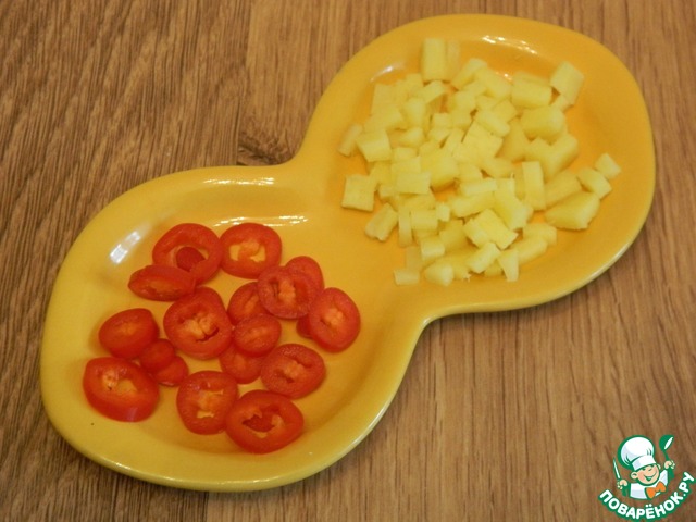 Имбирь порежем мелкими кубиками, горький перец маленькими кружочками, не допуская попадания семян.