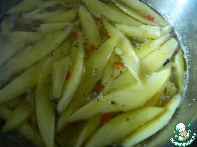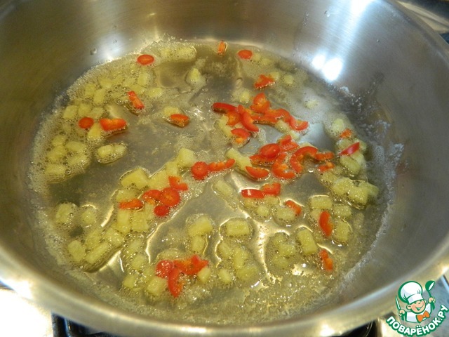 Следом мелко порезанный горький перец, дадим им немного прогреться.