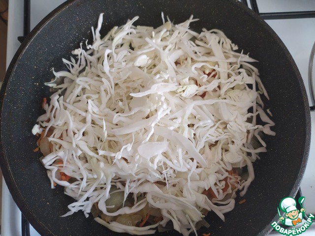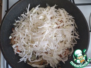 Лук, морковь мелко нарезаем и обжариваем до полуготовности. Добавляем нашинкованную капусту и тушим все до готовности.
