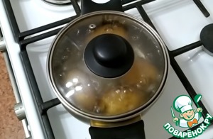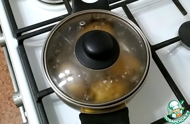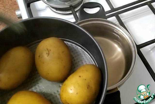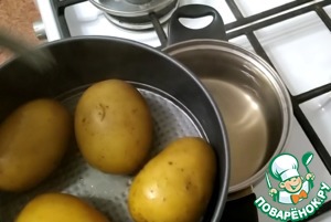 Картофель нужно тщательно вымыть и отварить в подсоленной воде до полуготовности, минут 10.