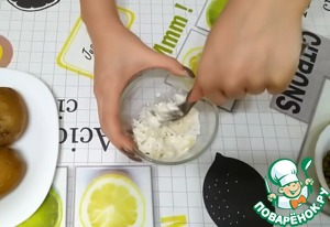 Пока картофель остывает, в отдельную мисочку выкладываем творожный сыр с зеленью.