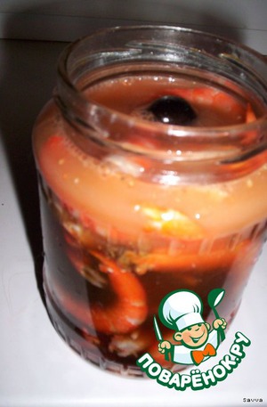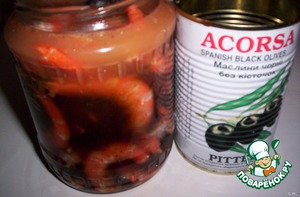 - в емкость сложить креветки, залить соком маслин и жидкостью, которая стекла с панцирей