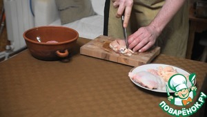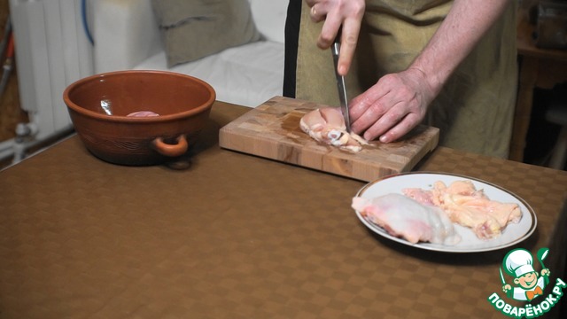 С курицы снять кожу, и сделать на каждом порционном куске по 2 глубоких поперечных надреза.