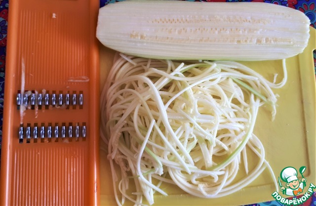 Поругиваясь сначала про себя, а потом и вслух, натираем на тёрке для моркови по-корейски молодой, красивый кабачок. Старайтесь натереть только кабачок, так как если вы натрёте ещё и свои пальцы, то блюдо перестанет быть вегетарианским))