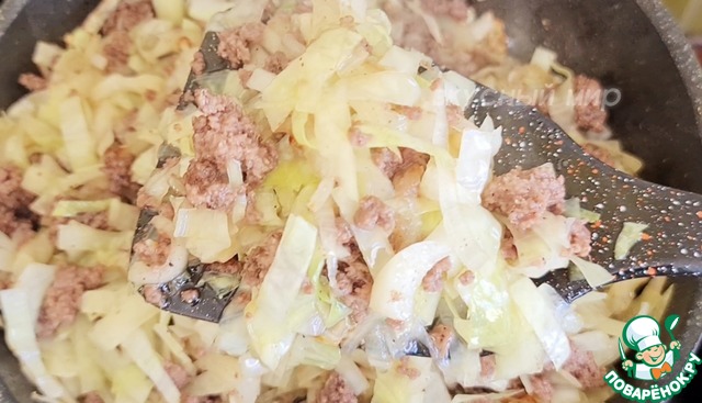 Пока тесто поднимается, приготовим начинку. В сковороду наливаем растительное масло, фарш слегка притомить на сковороде и сразу же добавить лук. Немного перемешать и добавить капусту. Перемешать и добавьте соль и черный перец по вкусу, можно добавить любые специи которые вы любите. Помешивая, дать капусте слегка опуститься и выключить огонь. До готовности начинку доводить не нужно.
