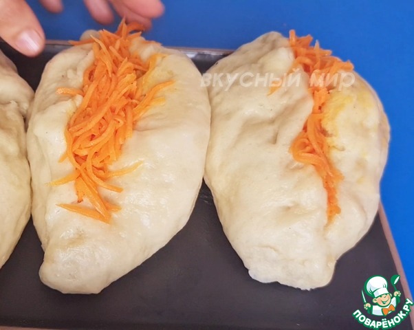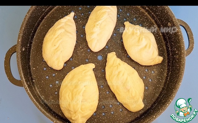 Каждый шарик раскатать в лепешку, распределяя тесто руками. Тесто достаточно мягкое и легко распределяется пальцами. В центр лепешки выложить начинку и залепить пирожком. Скреплять края нужно тщательно, чтобы при варке и подъеме тесто не разошлось.