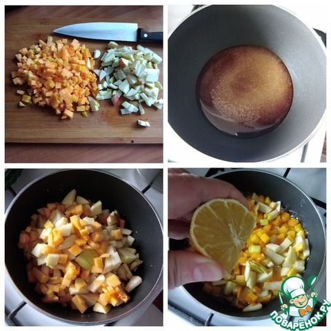 Для начинки я сделаю тыквенно-яблочный джем. В сотейник насыплю сахар, добавлю 1 ст л воды и растоплю его. Выложу порезанную тыкву мелко и так же - порезанное яблоко. Поварю минут 15 и отожму лимонный сок прямо в сотейник.