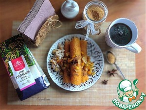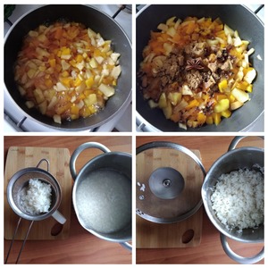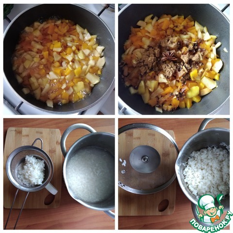 Перемешаю, поварю ещё минут 5, присыплю корицей, положу звёздочку бадьяна, опять перемешаю, накрою крышкой и сниму с огня. Пусть стоит и остывает джем. Рис к тому времени сварился и я через сито солью с него отвар. Рис остался в кастрюле липкий. Чтобы положить его в начинку, я его промою.