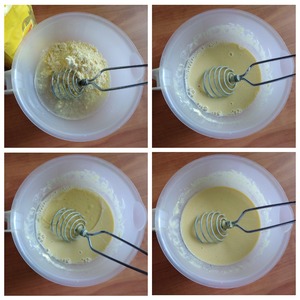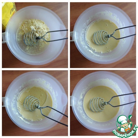 Делаем тесто для блинов. В отвар кладём сахар, разрыхлитель, венчиком соединяем. Добавляем кукурузную муку, опять венчиком соединяем. Наливаем масло подсолнечное, соединяем. Тесто готово и оно по консистенции такое, которое должно хорошо растекаться на сковороде, чтобы блины получились тонкими. Отодвигаем его в сторону, пусть немного постоит перед выпечкой.