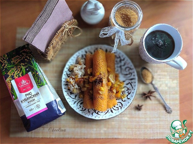 Тесто для блинов сделано на рисовом отваре с кукурузной мукой. Для начинки я сделаю джем из тыквы и яблока с лимонным соком, корицей и бадьяном. Добавлю к джему рис. Это был завтрак.
