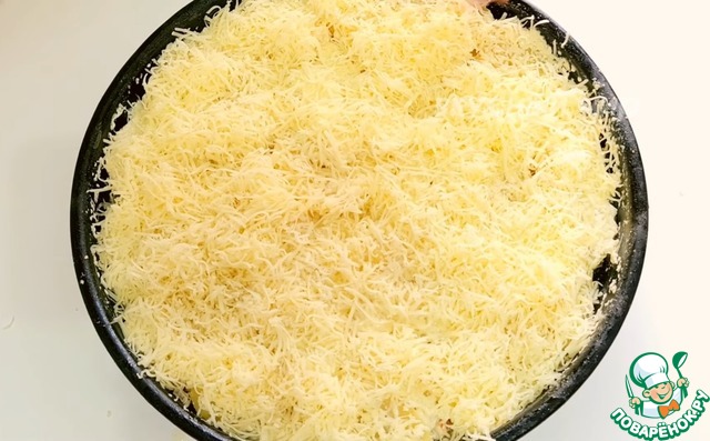 Затем снимаем фольгу и посыпаем тертым сыром и поставим еще на 10 минут до золотистого цвета.