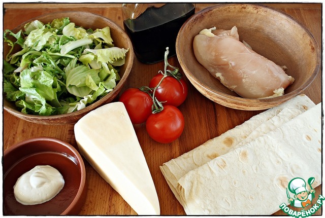Смешиваем обе горчицы с йогуртом, получившийся соус весь наносим на нижнюю левую часть лаваша, сверху укладываем листья салата, выше кладём обжаренную грудку, правее помидоры, а подними выкладываем сыр, нарезанный пластинками. Я натёр на тёрке - мне нравится когда он растекается по всей "округе", булькает и становится зажаристо-хрустящим...