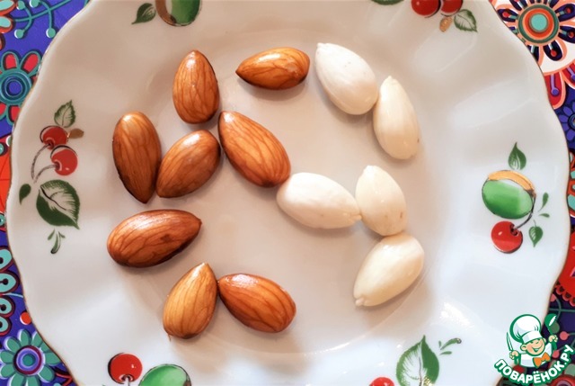На ночь замачиваем миндаль. Заливаем его кипятком, как остынет - убираем в холодильник. Перед приготовлением снимаем с миндаля шкурку, она очень легко отходит.