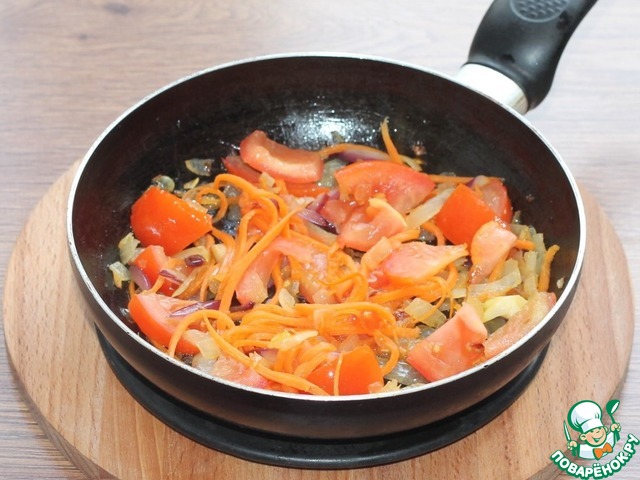 6. К пассерованным овощам, добавляем порезанный дольками помидор, тушим минуты 3.