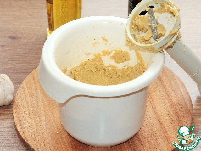 2. Приготовим намазку. Нут заливаем водой и оставляем на ночь. Затем воду сливаем, нут промываем и снова заливаем водой (1:5). Доводим воду до кипения и варим нут на медленном огне под крышкой в течение 90 минут или до готовности. В конце варки солим по вкусу. Готовый нут откидываем на дуршлаг. Отвар оставляем (100 мл).