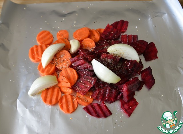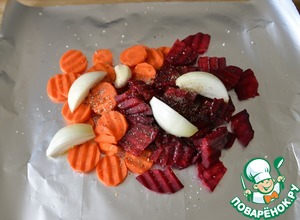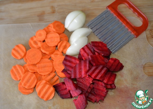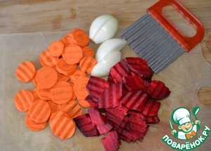 Свеклу и морковь режем в зависимости от диаметра на кружки (половинки, четвертинки) толщиной 3 мм. Я использовала фигурную нарезку, но это не принципиально. -
