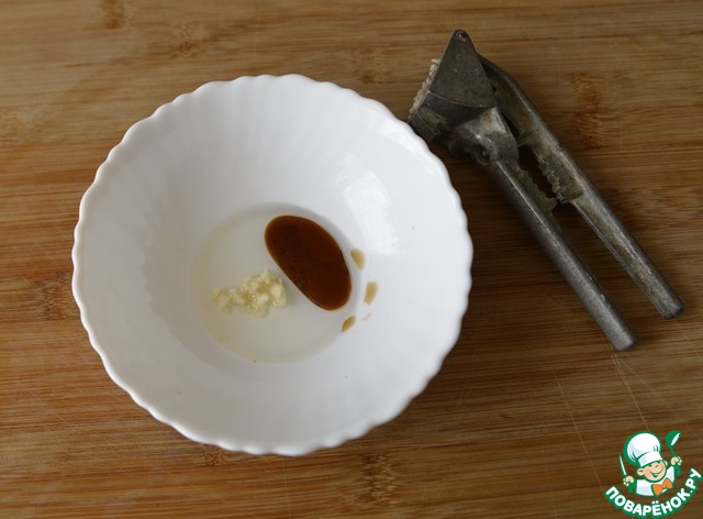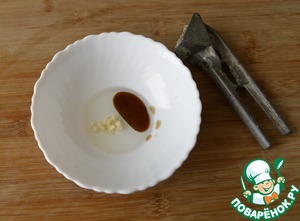Делаем заправку. Смешиваем масло, бальзамический уксус, выдавливаем чеснок.