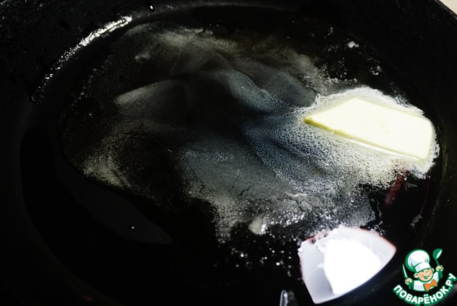 Растапливаем на сковороде сливочное масло. Делать это нужно на среднам огне, т. кю сливочное масло быстро начнет гореть. Но обжарка именно на сливочном масле даст капусте неповторимую молочную нотку. Добавляем к сливочному маслу 2 ст. л. растительного