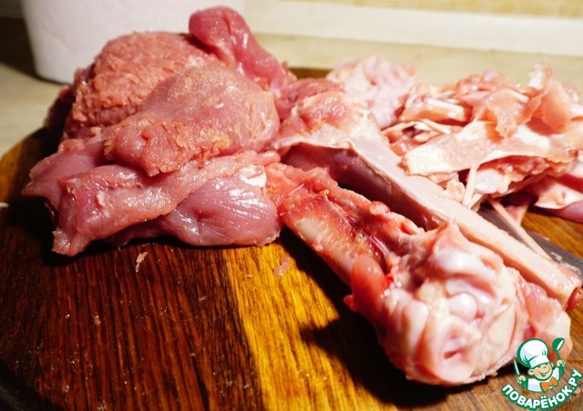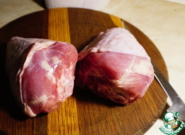 На мясо я взяла небольшие индюшиные голени. К сожалению, в ингредиентах можно было указать только индюшиную грудку. Можно взять любое другое мясо: курицу, свинину, телятину. Можно и говядину, но она может выйти жесткой. Ее надо будет предварительно протушить.