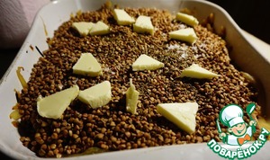 Выкладываем 50 гр. сливочного масла, нарезанного слайсами.