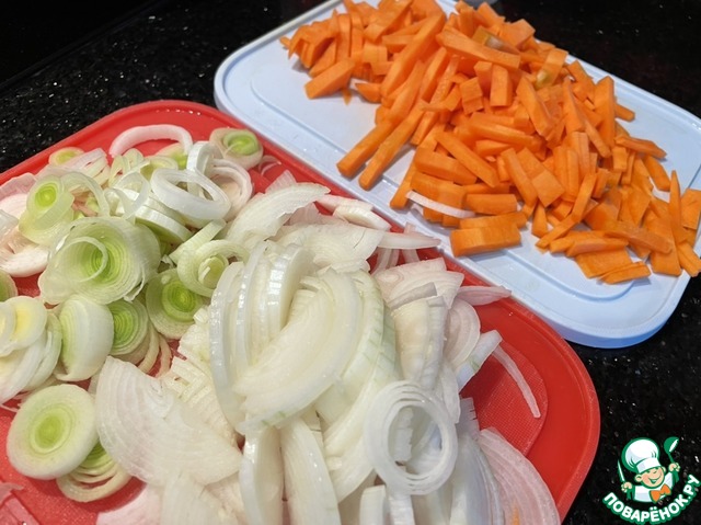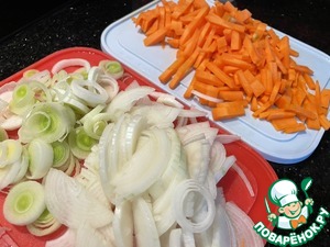 Очистите морковь и шалот. Порей промойте. Тонко нарежьте все овощи.