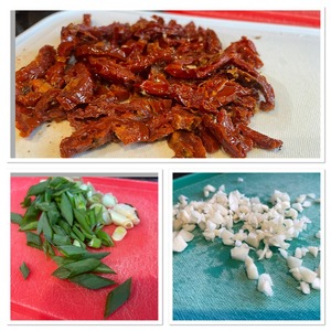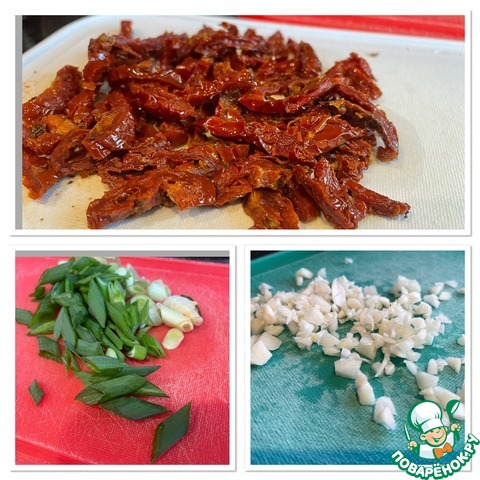 Тонко нарежьте вяленые помидоры. Мелко нарежьте чеснок и зелёный лук.