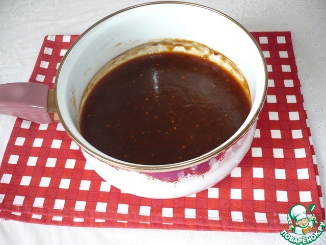 Переливаем соус в сотейник и ставим на огонь. В горячий соус тонкой струйкой вливаем крахмал с водой и быстро перемешиваем, чтобы не образовалось комочков. Соус готов.