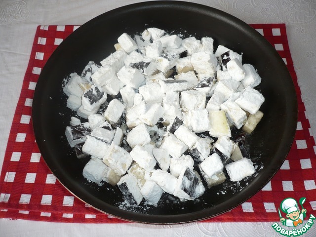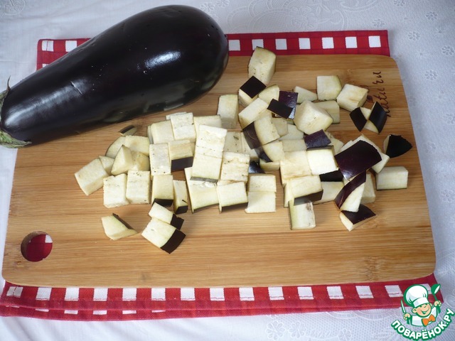 Баклажаны почистить (я этого не делаю) и нарезать крупными кубиками.