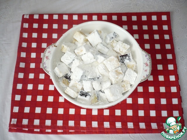Обваливаем кубики баклажанов в кукурузном крахмале. Для удобства кладём их в миску, насыпаем крахмал и перемешиваем.