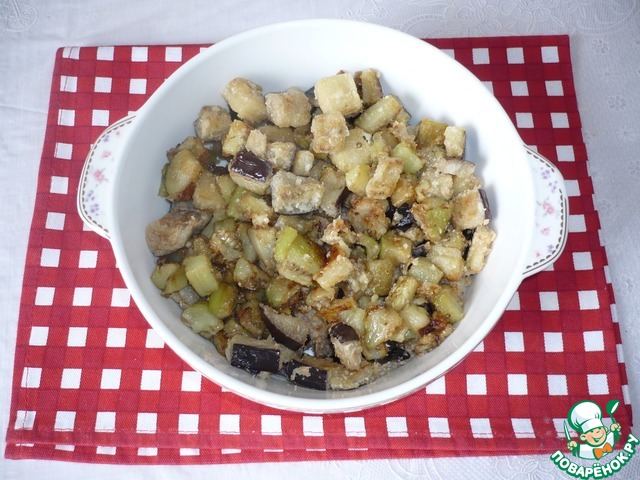 Разогреваем растительное масло в сковороде и на разогретом масле на сильном огне обжариваем кубики баклажанов 5-7 минут, посолите и поперчите по вкусу.