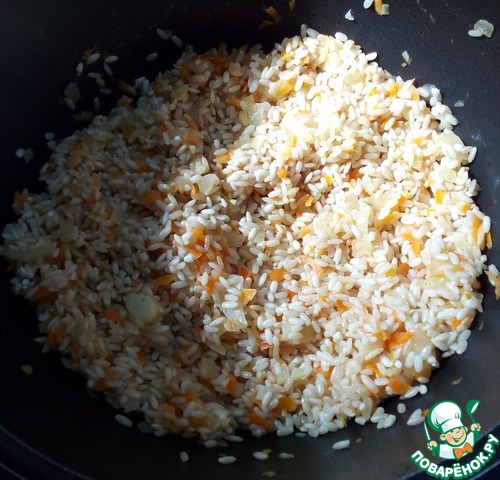 В казан налить 2 ст. л. растительного масла, прогреть. Репчатый лук измельчить, пассеровать. Морковь натереть и добавить к луку обжариваться. Подсолить, перемешать. Добавить ранее промытый рис, перемешать, дав ему пропитаться овощным соком и маслом. Залить 4 стаканами кипячёной воды (можно чуть меньше, так как рис заранее замачивался и успел впитать в себя часть воды). Довести до кипения, варить на умеренном огне. Грибы в это время снять с огня, слить воду, тщательно промыть и отправить к рису, перемешать. Посолить, поперчить, добавить специи, перемешать, довести до кипения, а затем убавить огонь до минимума, накрыть казан крышкой. Готовить блюдо в течение 20 минут (на приготовление риса у меня ушло минут 35). За пять минут до подачи огонь потушить, но крышку не снимать, дав рису впитать в себя возможно оставшуюся жидкость. При желании можно положить пару зубчиков чеснока.