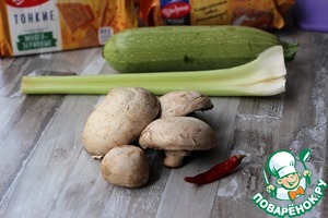 Приготовить ингредиенты. Кабачок, сельдерей помыть, шампиньоны протереть влажной салфеткой