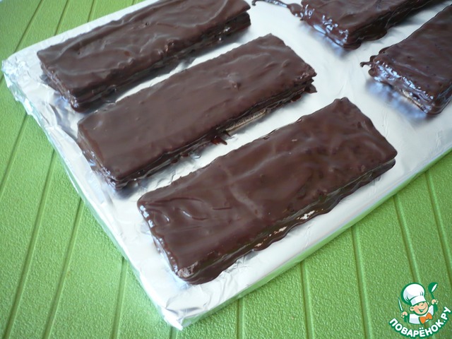 Затем в растопленный шоколад обмакните приготовленные батончики.