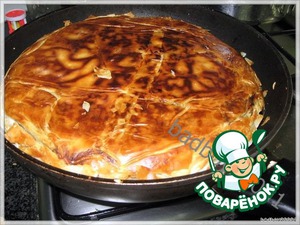 И слегка помогая, сдвигаем неподжаренной частью на сковороду и доводим пирог до готовности.