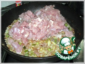 Как раз пора добавить мелко нарезанное мясо курочки, но не надо это мясо зажаривать до хрустящей корочки, а только дадим время, чтобы оно впитало в себя все вкусы.