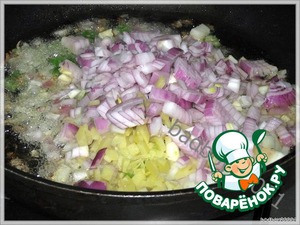 Налив в сковородку растительного масла, кладем все вместе и жарим до готовности лука -