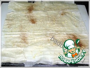 Надо взять один листик, смазать кисточкой растительным маслом, присыпать молотыми орешками или панировочными сухариками, немного сахара и корицы - и так 4-5 листов. -